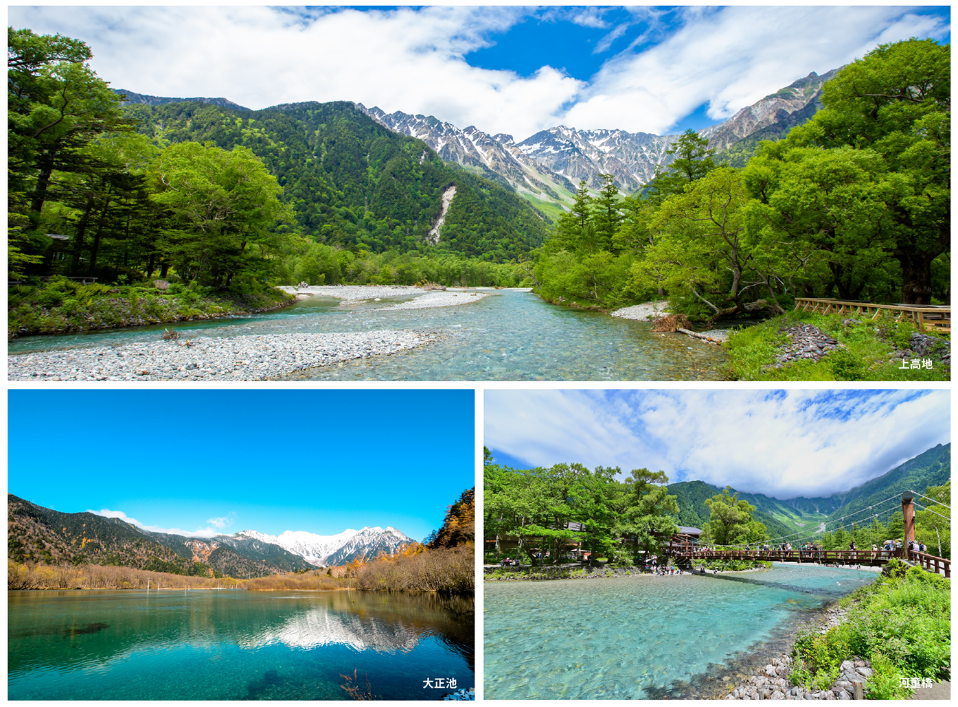 信州地區首屈一指的天然景點,屬於中部山岳國立公園,上高地的名稱有另外的一層意思是說:此等的美景是神賜予我們的禮物。因長期與外界隔離,蘊藏了極豐富的動植物資源,成為大自然良好的生態棲息地,絕佳的景色在 19 世紀經英國傳教士登山家的介紹而被世界所知。