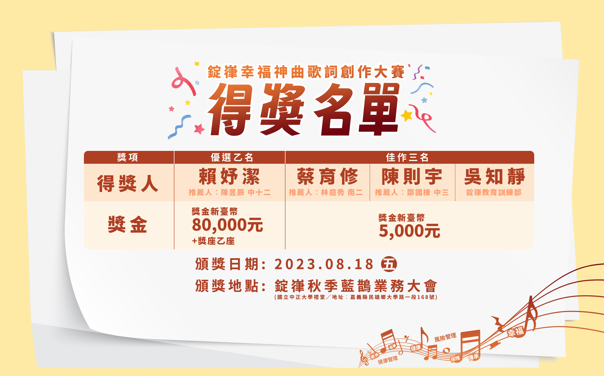 - 得獎作品之著作財產權及各項權利均歸屬錠嵂保險經紀人股份有限公司所有。
