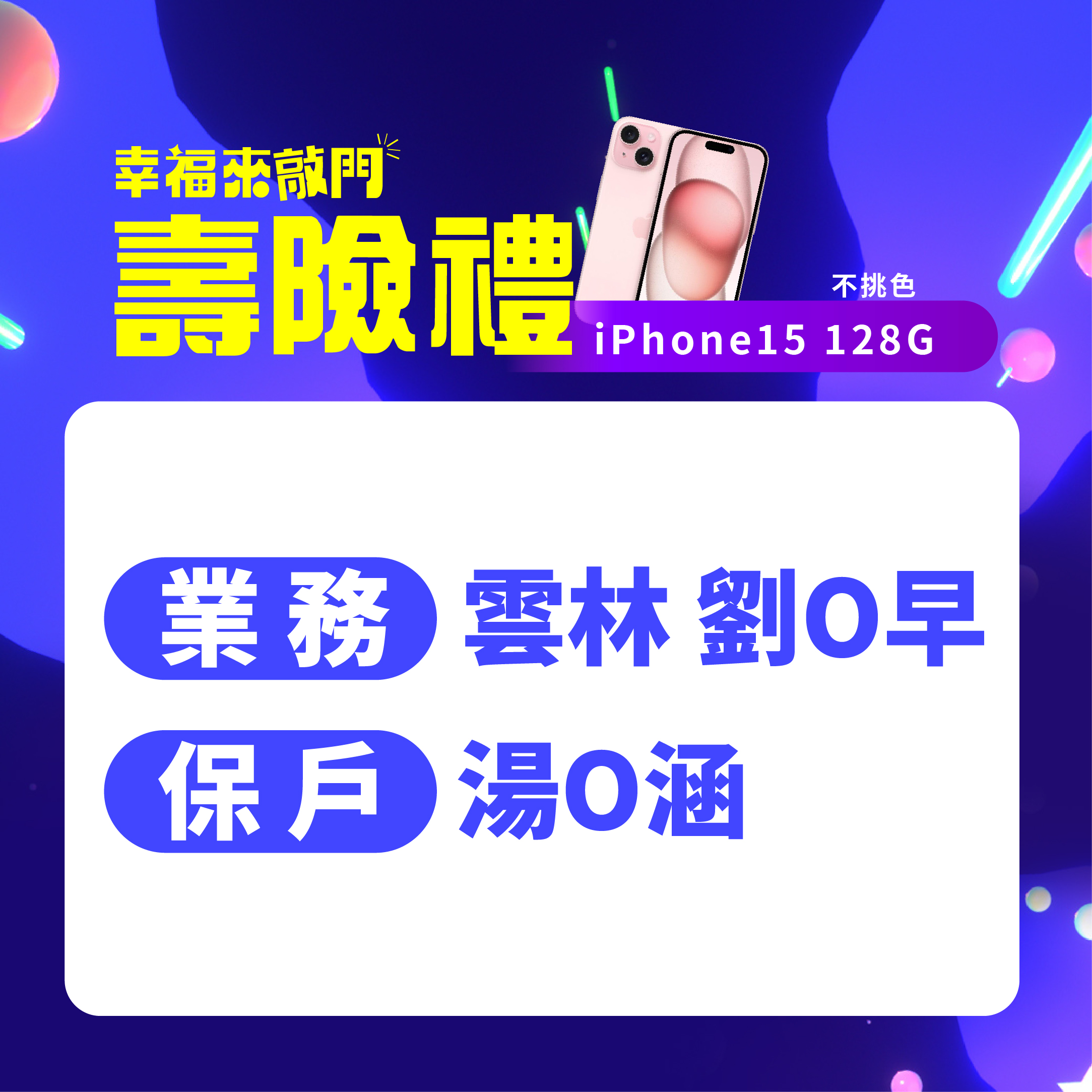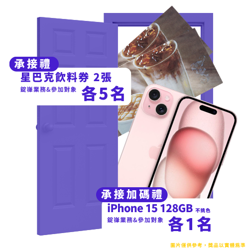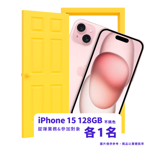 活動期間【承接保戶】於承接業務之【精品業務連結】填單,並完成任一險種投保,即有機會抽【承接加碼禮】iPhone 15 128G 乙台(每人限乙次抽獎機會)