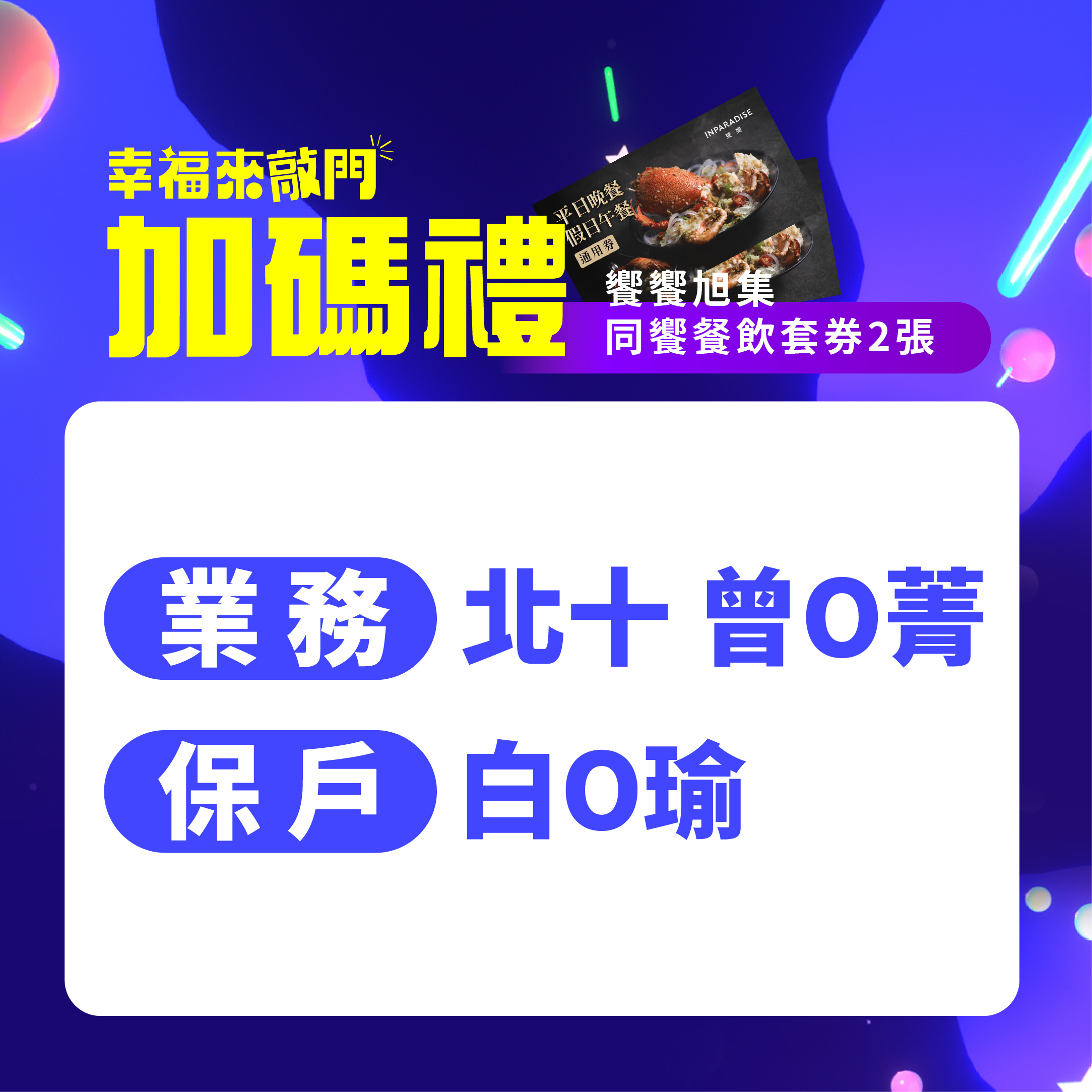 活動期間於【錠嵂單位專屬連結】或【錠嵂精品業務連結】 並完成任1投資型保單或外幣險種投保,可抽【加碼禮】(每人限乙次抽獎機會)