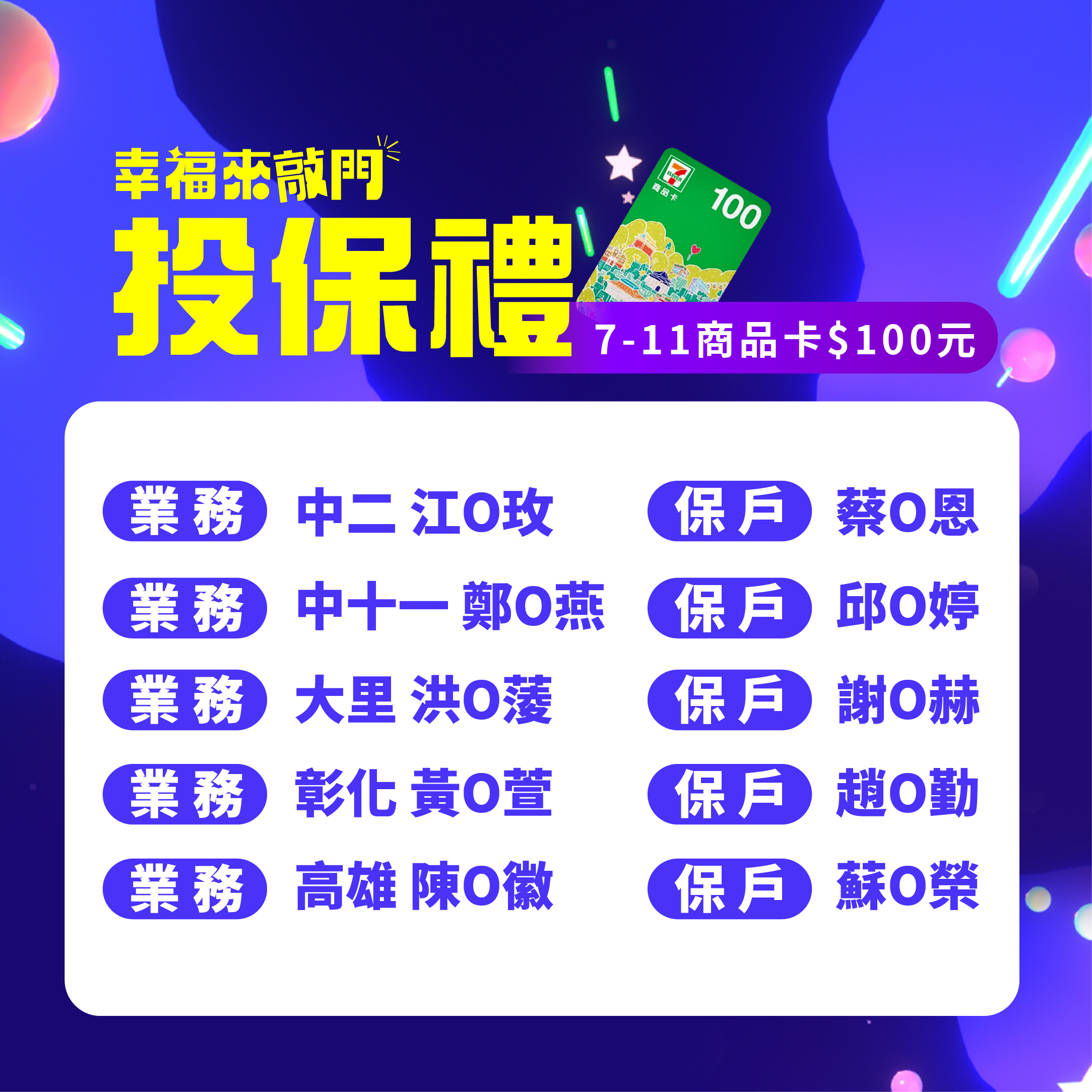 2.此為機率抽獎,不保證投保筆數達一定數量即可中獎,各獎項每人最多限得一份。 為維護抽獎權益及後續中獎聯繫,本活動需提供完整真實之姓名.身分證字號.Email及聯絡電話,若未填寫或填寫有誤者,主辦單位有權取消抽獎及中獎資格。