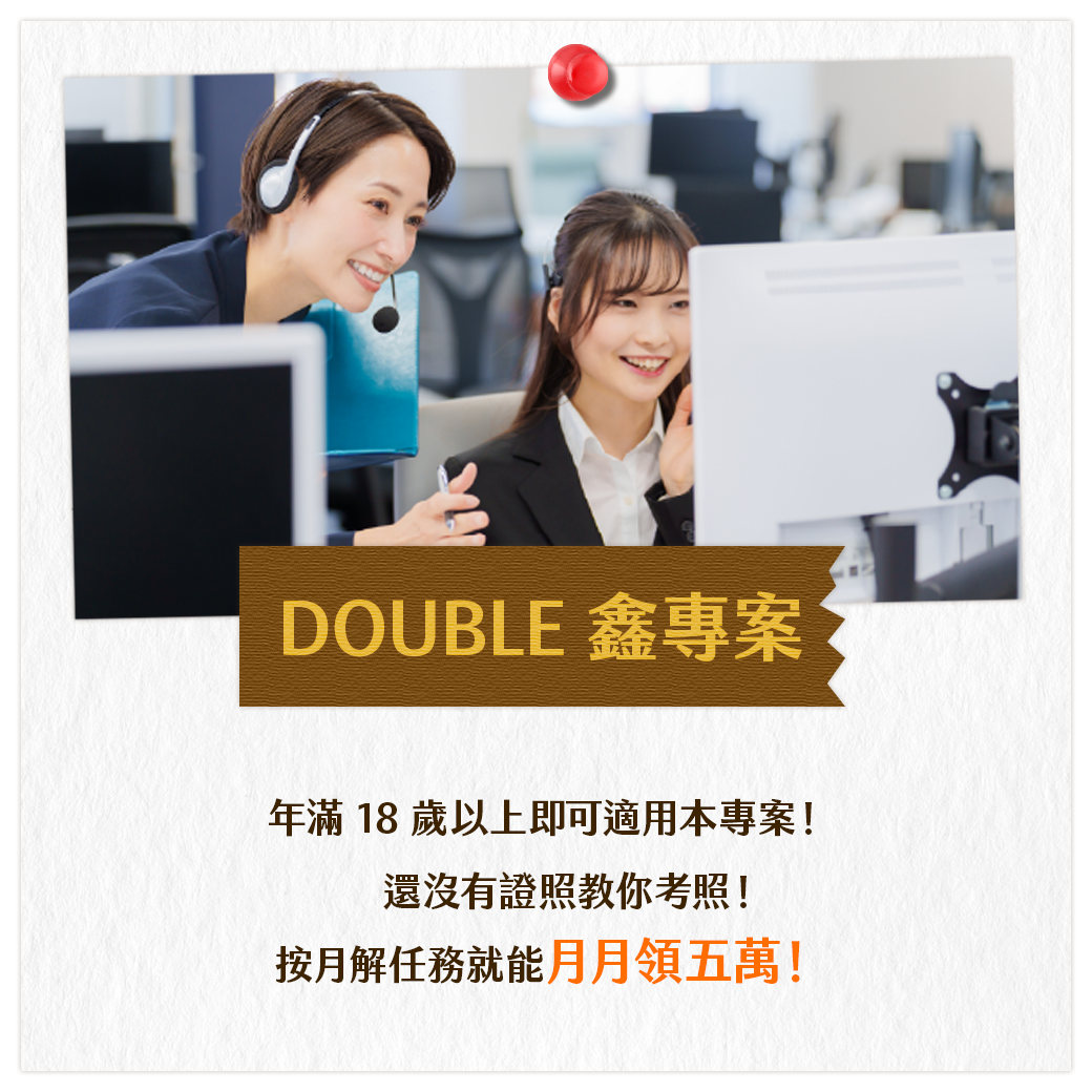 「Double鑫專案」專為新鮮人設計,提供穩定月收入五萬!凡高中/職以上、年滿18歲者皆可加入。助你輕鬆踏入保險事業,開啟成功之路!