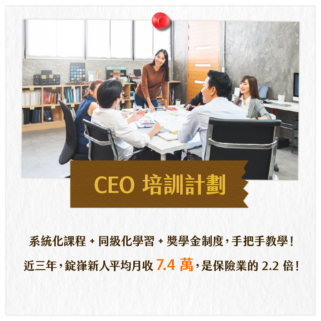 公司永續經營的關鍵在於對人才的投資!錠嵂保經以專業的CEO培訓計劃幫助你實現事業轉型,為你帶來更廣闊的發展空間!